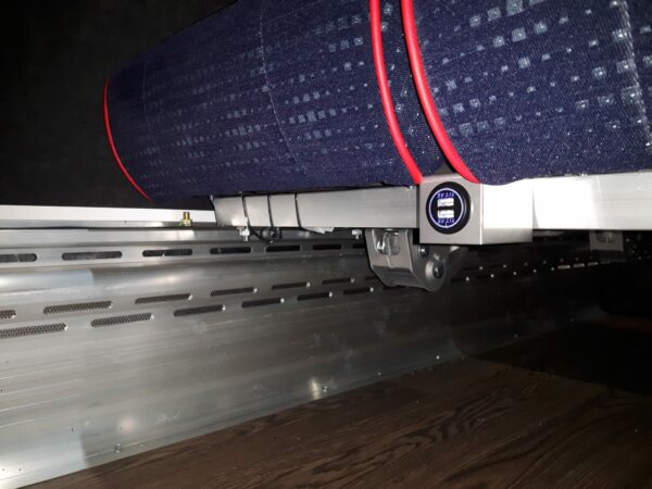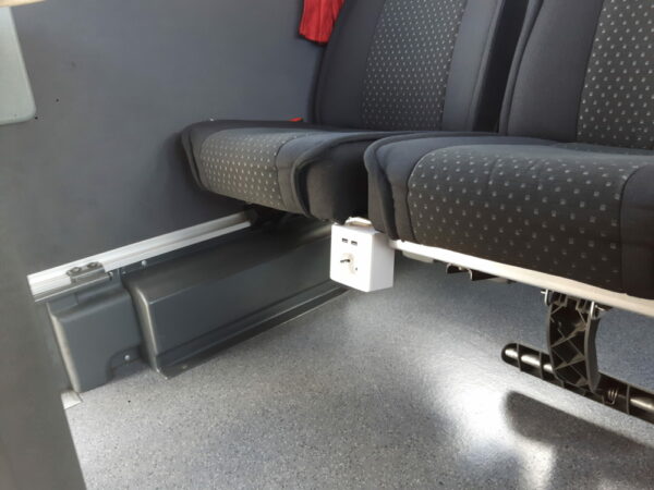 Gniazdka podwójne 230 V zamontowane miedzy siedzeniami pasażerów na uchwycie wykonanym z blachy nierdzewnej.